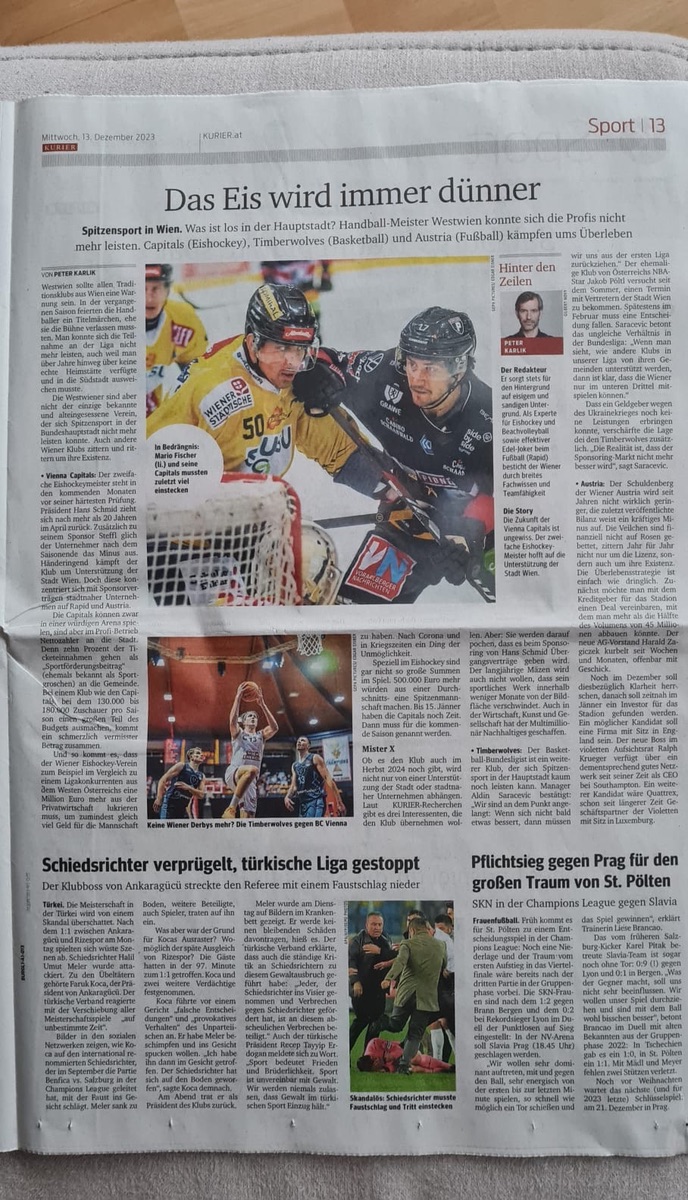 Sportstadtrat Hacker ist kein Freund des Spitzensports. Auch der österr. Fraueneishockeyrekordmeister Sabres bekam keine Hiilfe von der Stadt. Westwien, Timberwolves usw. eh im Artikel erwähnt, so weit ich weiß auch der Judoklub Galaxy bei der Sportstars Gala mit schönen Worten bedacht, aber ohne Hilfe. "Highlights" der Aussagen gegenüber den Sabres: vom Dachverband: "nehmts euch einen Kredit", von einer Mitarbeiterin Hackers "ich bin mir die Füße für euch wundgelaufen."..... :veryhappy: . Ich hoffe für die Caps sie haben da mehr Erfolg, bin da aber sehr skeptisch!