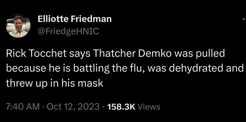 Ich hoffe, ihm geht es bald besser, sie haben ihm leckere Infusionen angehängt, d.h. er wird ohne gröbere Probleme nachhause gegangen sein. Ich denke, er spielt spätestens nächsten Freitag wieder.