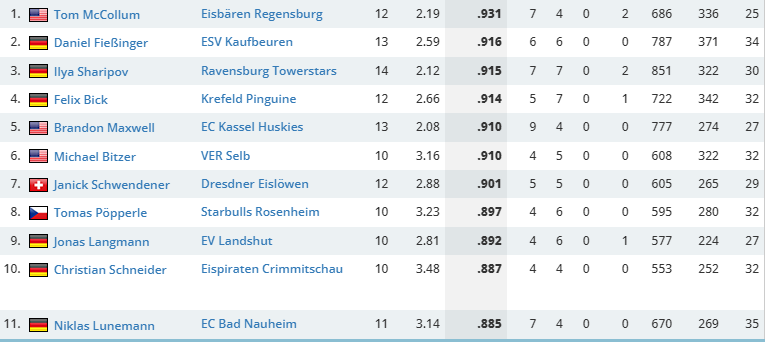 Ich weiß nicht was Regensburg für ein System spielt aber McCollum ist in der DEL2 auf Platz 1 (nach SV% - bei mehr als 10 Spielen)