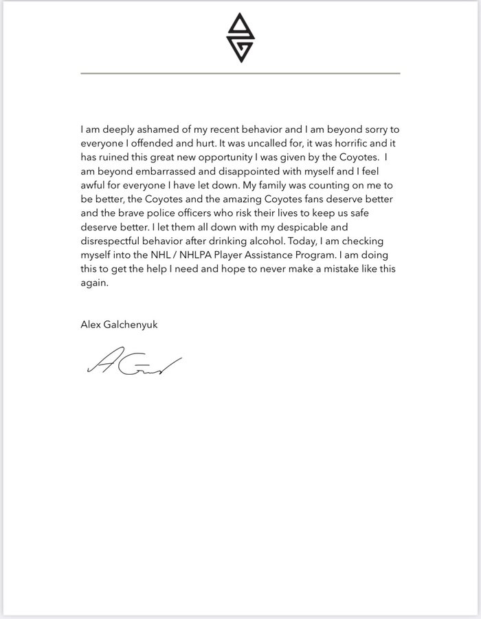 Alex Galchenyuk wird kein drittes Mal für die Yotes auflaufen - der Vertrag wurde vom Klub aufgelöst, nachdem der Spieler am 9.Juli eine Nacht hinter Gittern saß: Fahrerflucht, Widerstand gegen die Staatsgewalt,...