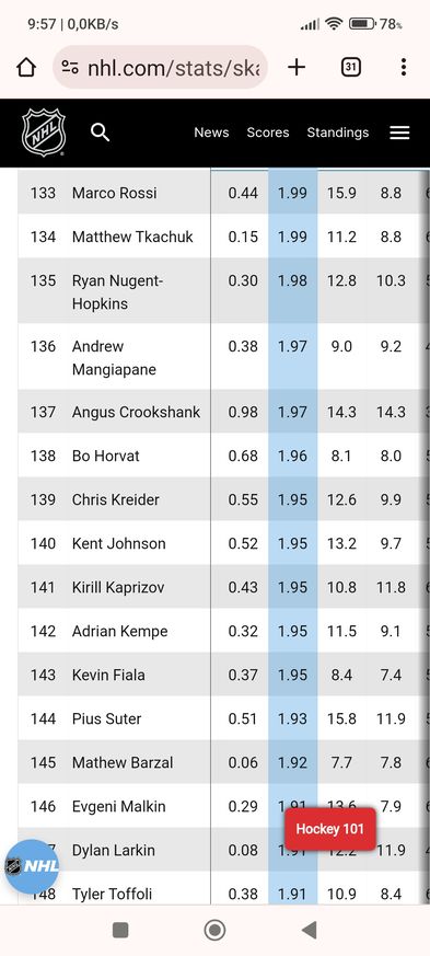 Rossi bei 5v5 mit knapp zwei Punkten pro 60min auf Platz 133 in guter Gesellschaft, tolle Leistung für einen