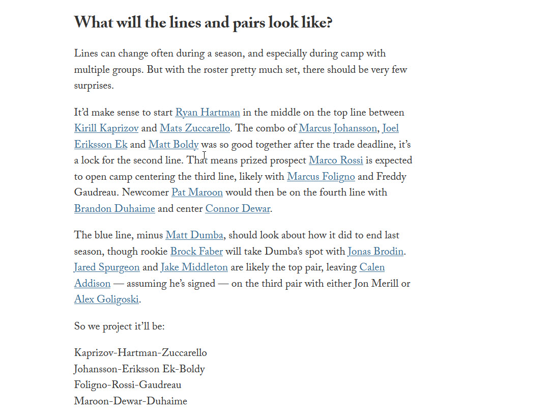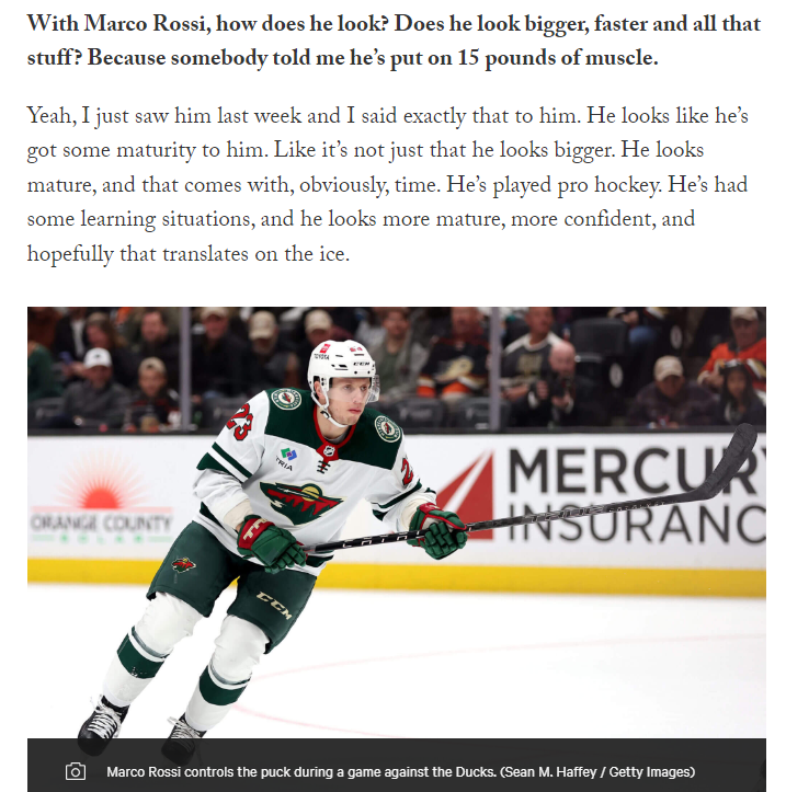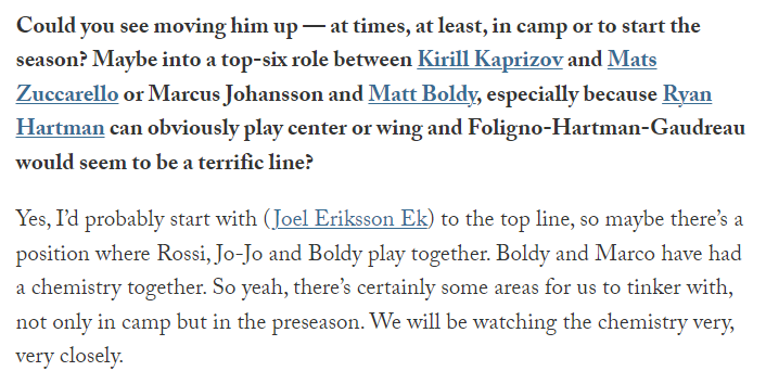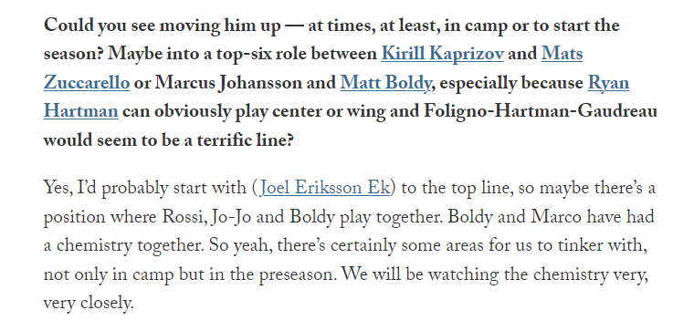 Kaprizov, Boldy, Ek, Hartman, Gustavsson, Middelton & Brodin hast dann mit Rossi+Addison im Idealfall einen guten Stamm im gutem Alter, worum man dann eine gscheide Mannschaft aufbauen kann.