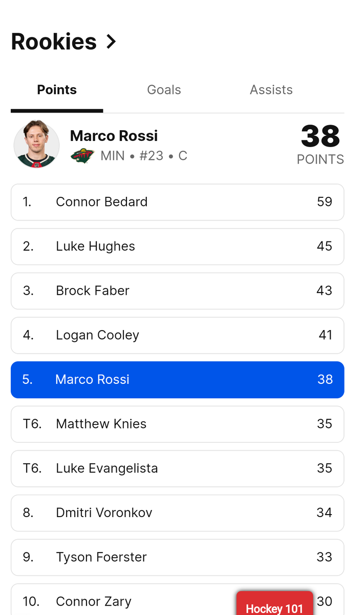In der Rookiewertung Rossi auf Platz 5 abgerutscht, trotzdem eine gute Saison von ihm wo er bis jetzt alle Spiele bestritten hat.