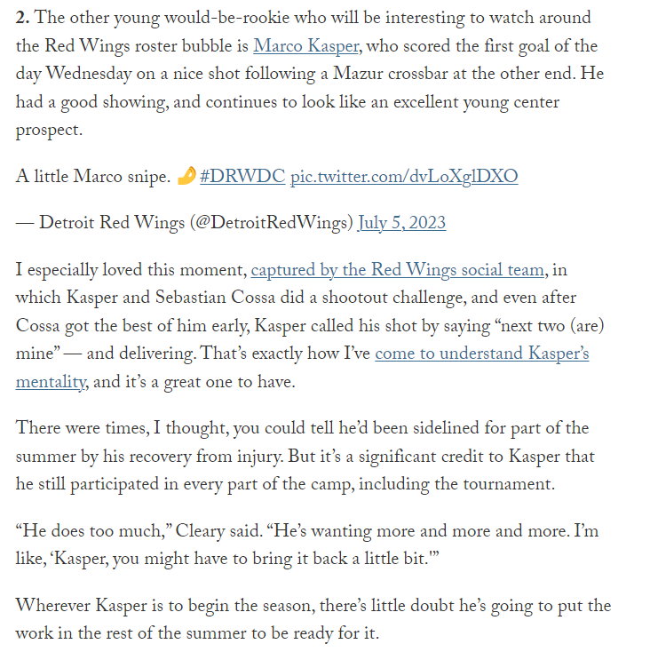 Laut den The Athletic Red Wings Schreiberlingen wird es schwer für Marco in open night line up zu kommen ... von den Rookies glauben sie am ehesten das es Mazur schaffen könnte .... trotzdem spannend was sie über Kasper sagen.