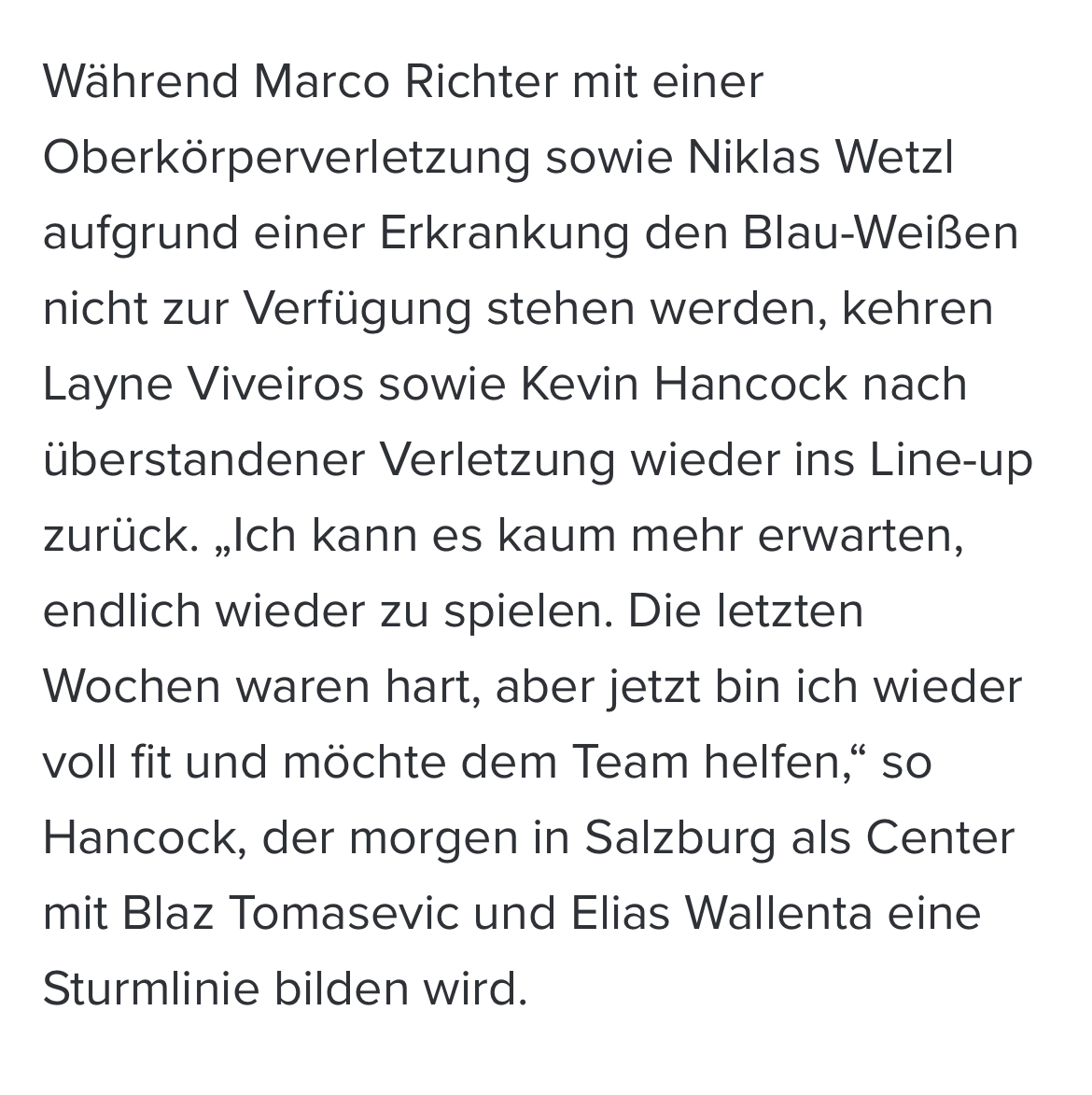 Nein, aber mMn. ist das vorerst eine kluge Entscheidung Hancock die Linie um Tomazevic centern zu lassen. Der durchaus gute Saisonstart gibt dem restlichen Team momentan einfach recht, und es wäre schade diesen Fluss jetzt zu brechen. Wer weiß was in ein paar Spielen passiert - Mit Verletzungen ist immer zu rechnen, und dann mischen sich die Karten ohnehin neu und es muss notgedrungen umgestellt werden.
