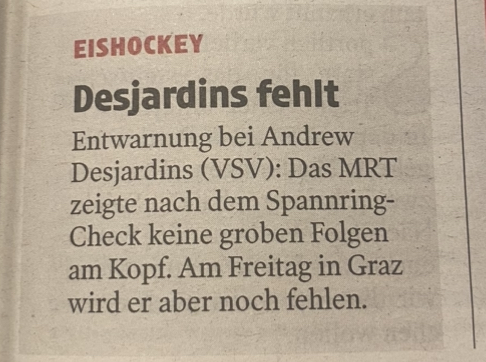 lt. KLZ Desjardins KEINE Gehirnerschütterung, der Kopf und Nackenbereich wird aber nochmal genauer untersucht. Klingt schonmal vorsichtig nach Entwarnung.