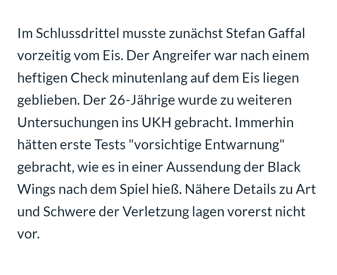Mein Eindruck aus der Halle, bzgl. Gaffal, hat für mich so ausgesehen, als wäre was mit der linken Schulter. Er lag zunächst am Bauch und der linke Arm war unnatürlich abgestreckt. Bergung dann mit Schaufeltrage, möglicherweise Vorsichtsmaßnahme wegen potentieller Rückenverletzung. Beim Rausfahren hat er gewunken. Puck in den Nacken hab ich nicht gesehen, ging aber wahnsinnig schnell und keine Wiederholung in der Halle. HOFFENTLICH ist es es nicht allzu schlimm! Alles Gute!