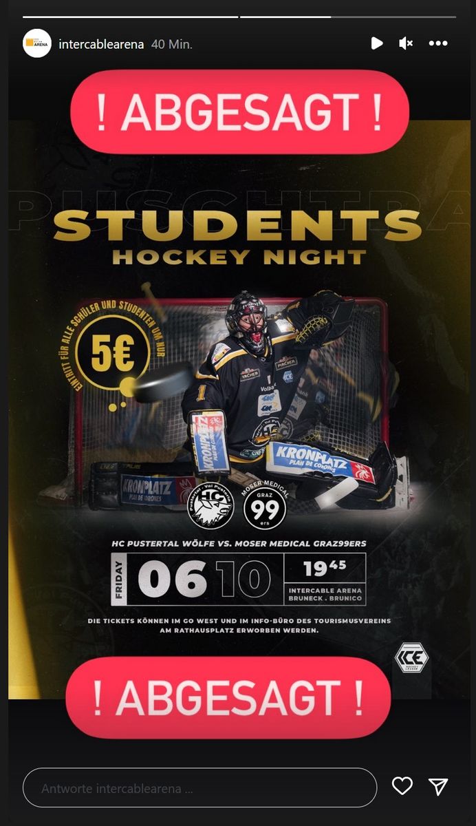 𝗦𝗣𝗜𝗘𝗟 𝗚𝗘𝗚𝗘𝗡 𝗚𝗥𝗔𝗭 𝗔𝗕𝗚𝗘𝗦𝗔𝗚𝗧!! ❌ Die Graz99ers haben die win2day ICE Hockey League heute Vormittag darüber informiert, dass der Großteil ihrer Spieler krankheitsbedingt ausfällt und von der medizinischen Abteilung der Steirer für die kommenden beiden Spiele – heute Abend in der Intercable Arena sowie am Sonntag, gegen die Steinbach Black Wings Linz – keine Freigabe bekommen. Somit muss das Heimspiel der Wölfe heute Abend leider abgesagt werden. Über die weitere Vorgehensweise entscheidet die Rechtskommission der win2day ICE Hockey League, alle Tickets behalten vorerst ihre Gültigkeit. Ob und wann das Spiel nachgeholt wird, steht Stand jetzt noch nicht fest. Wir bitten um euer Verständnis! Anstelle des Spiels organisiert der HCP ab 19:00 Uhr eine DISCO ON ICE - Spieltagstickets sowie alle Abos berechtigen zum freien Eintritt!! 🐺 #HCPustertal