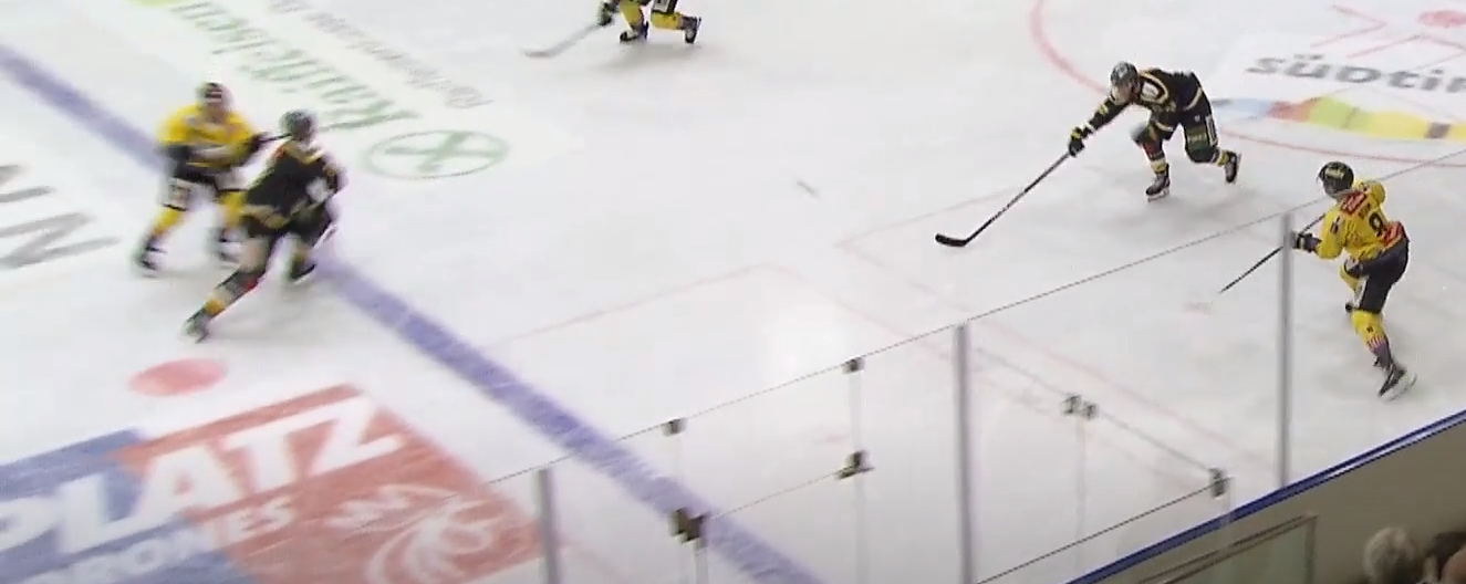 Der Wiener ist hier leider etwas abgeschnitten, aber kurz vorher beginnt Schofield sich in Richtung des Wieners zu bewegen und fährt gefühlt eine Ewigkeit in Richtung des Wiener Spielers, um den puckführenden Spieler den Passweg zu nehmen. Der Wiener nimmt gleichzeitig, die Bewegung Richtung Schofield auf. Dass Schofield nie im Sichtfeld des Wieners war, wage ich gehörig zu bezweifeln. Da musst schon Scheuklappen haben.