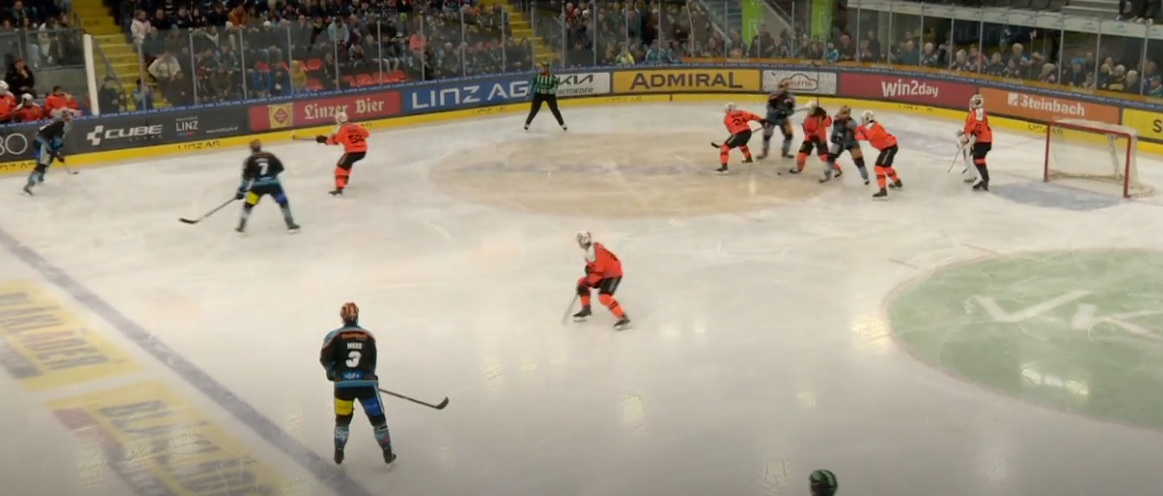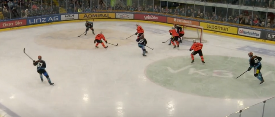Das ist ein Ausschnitt vor dem 5:3. Gefühlt orientiert sich jeder der Grazer nur am Spieler mit dem Puck. Roy (ganz links, weiß wohl selber nicht warum er auf einmal PK spielen muss) völlig außer Position. Roe kann dann problemlos im hohen Slot agieren und einschießen...