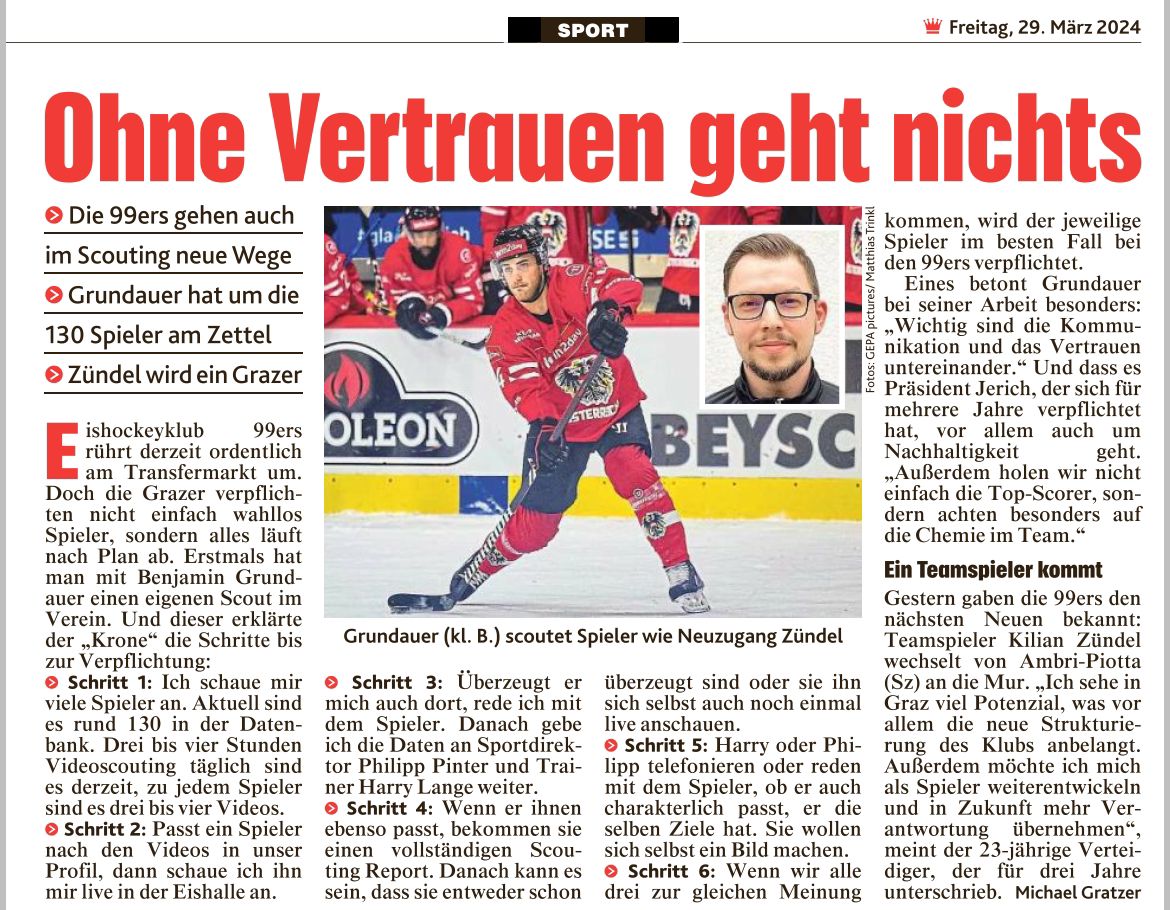 Artikel in der Kronen Zeitung bezüglich Scouting bei den 99ers!