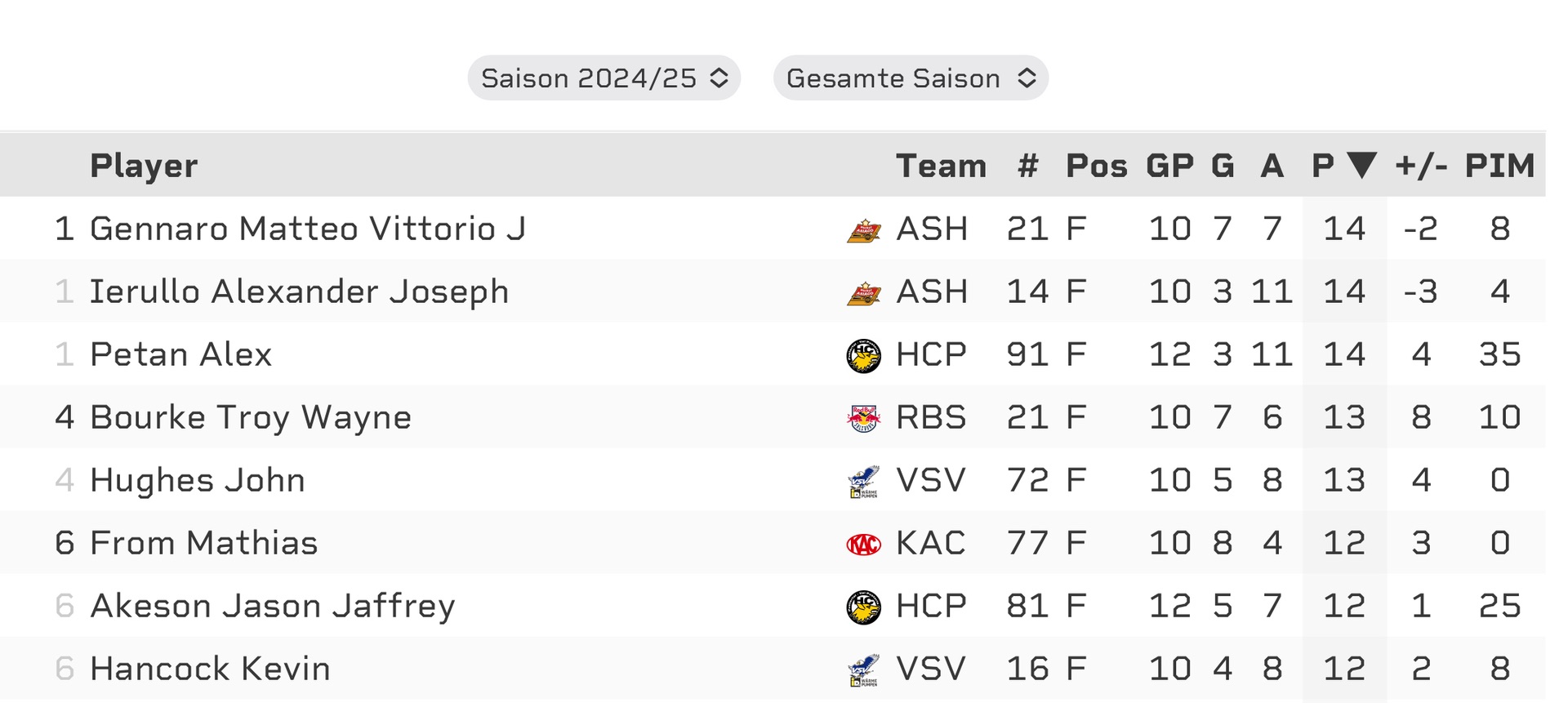 Nach 11 Spieltagen sind in der Skorerliste 3 Italokanadier mit je 14 Punkten in Front. Ziemlich überraschendes Detail; die erwarteten Bigs derzeit noch unter ferner liefen.