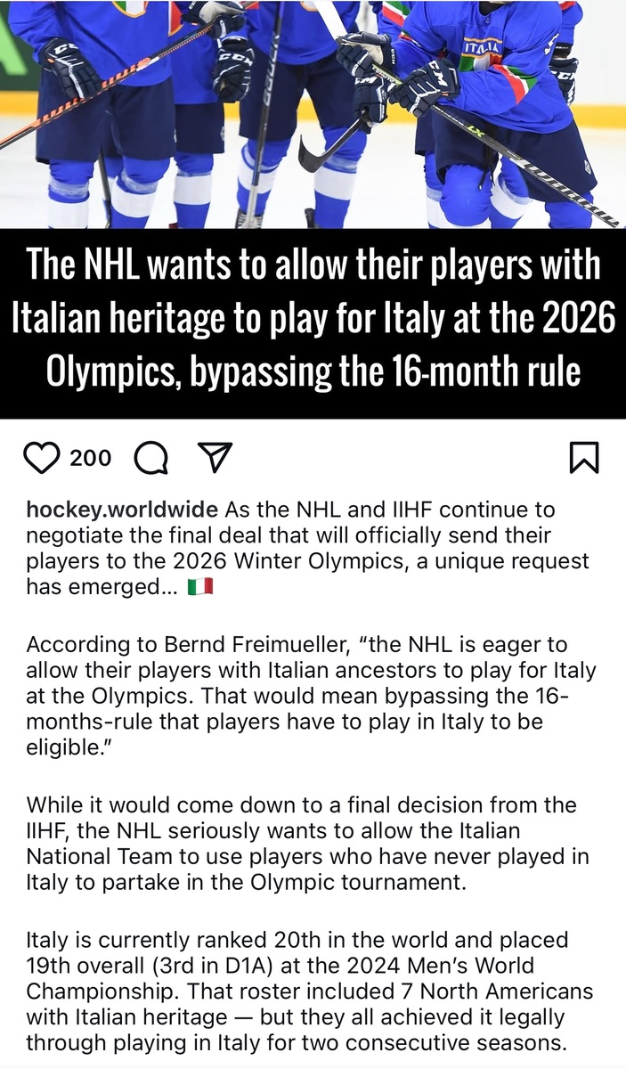 (und wenn gar ein früherer Einsatz für Kanada/USA auch kein Hindernis mehr sein sollte, kämen noch ein Haufen dazu - Bertuzzi, Carcone, Ceci, Cirelli, Donato, Fabbro, Fantilli, Ferraro, N. Foligno, Milano, Pacioretty, Palmieri, Perfetti, Pietrangelo, Pinto, Toffoli, Vatrano, Veleno, Vilardi)