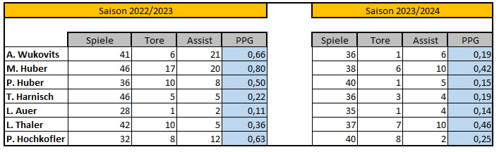 Da es mich selbst interessiert hat, hier eine Aufstellung der genannten Spieler, Vergleich Saison 2022/23 vs. 2023/24.