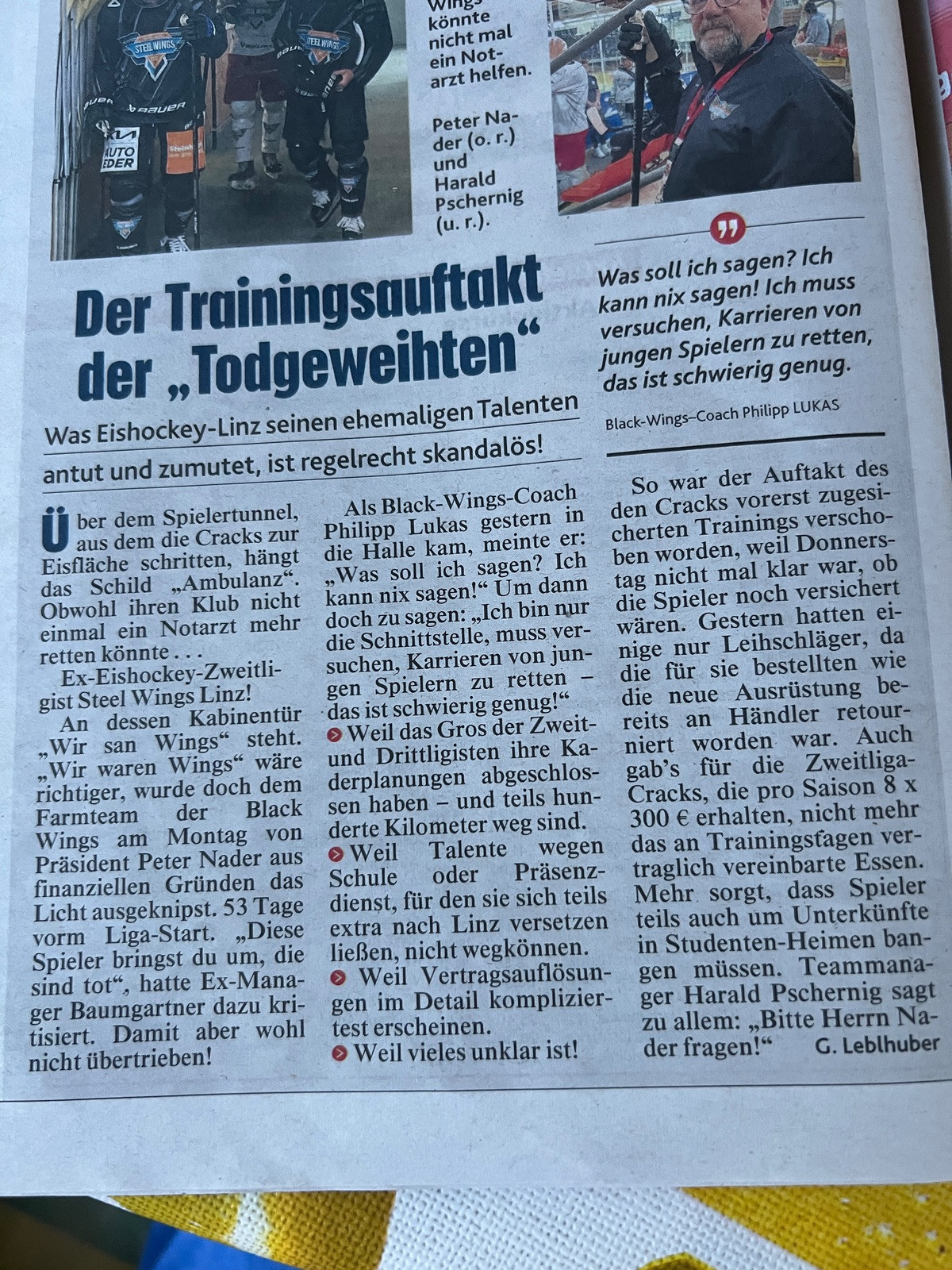 Nebenbei erwähnt - > Da die Steels in Linz die 2te Mannschaft waren ist dieser Fakt Grund fürs Ausbleiben von Sponsoren, Man kann im Gegenzug nix bieten - keine Werbeflächen in der Halle (besetzt von den Black Wings) keine Zuschauer, niemanden der den Livestream schaut ( der nebenbei ca. € 5.000,- pro Spiel kostet) einfach nix.