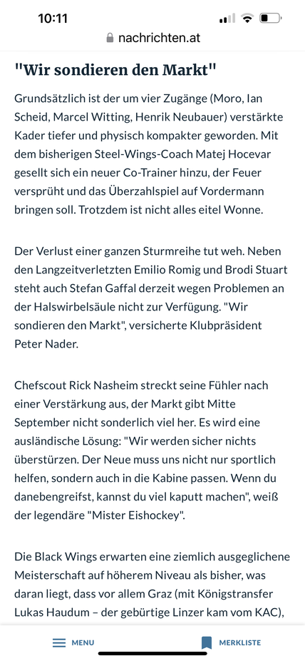 statt Romig könnten wir einen jungen Legio holen, der in den ersten Spielen der Saison in Schweden, CZ, DEL nicht ganz überzeugt, aber sonst bin ich zufrieden mit der Off-Season.