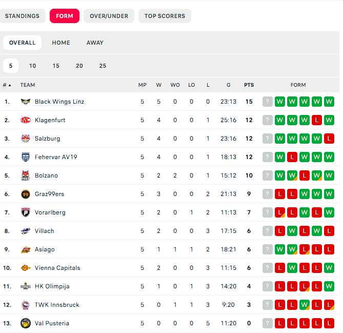 Sieht man sich die aktuelle Formtabelle der letzten 5 bzw. 10 Spiele an, dann schauen die wie folgt aus: