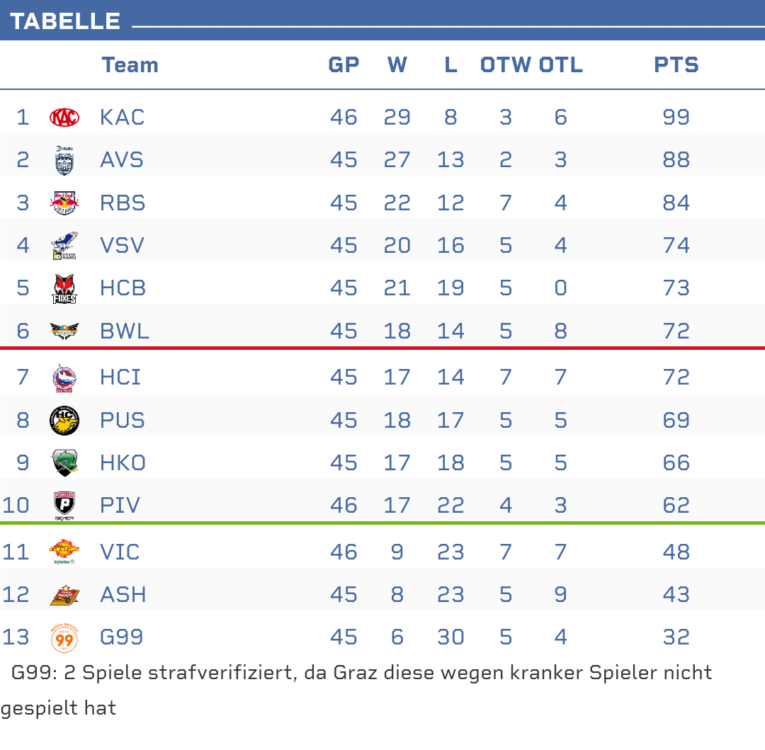 nachdem bozen vermutlich ihr restprogramm trocken runterspult muss der vsv mind. 2 punkte holen, für linz ists quasi schon ein pflichtsieg wenn man in die top 4 will. zusätzlich müssten die linzer dann auf den kac in der letzten runde hoffen, die sich aber in bozen vermutlich keinen hax‘n mehr ausreißen werden…