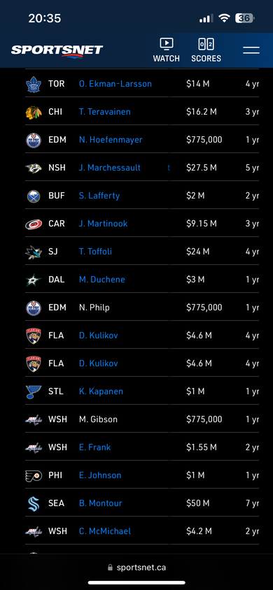 Allerdings klafft noch ein großes loch am flügel von Hughes und der cap space gibt jetzt nicht mehr viel her, nachdem man auch noch den vertrag von Mercer verlängern muss, ein top stürmer geht sich da wohl nicht mehr aus.