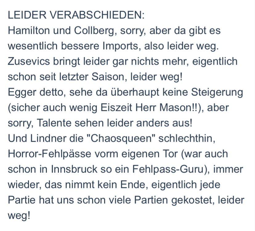 was willst von einem User erwarten, der seit Jahren krampfhaft versucht Negatives als Positives zu verkaufen, der letztes Jahr von Desjardins geschwärmt hat oder etwa heuer vor der Saison einen Katic als Top Transfer bezeichnet hat (wsl nicht wörtlich aber hochlobend und mit stats aus DEL gekommen bla bla)? ich hab schon einmal gesagt: er klingt fast wie vom VSV Vorstand bestellt, um hier gute Stimmung zu verbreiten :D