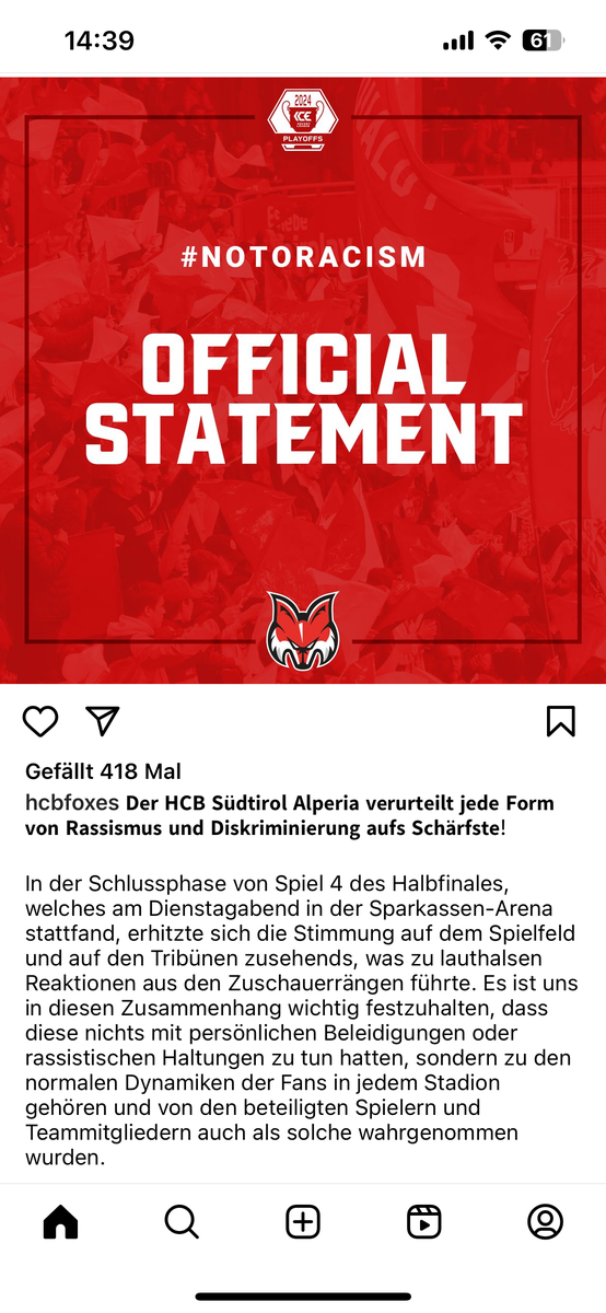 Auch interessant, dass es seitens des beschuldigten Vereines auch am nächsten Tag kein Statement kommt. Sogar Linz zeigt sein Mitgefühl und stärkt Ali den Rücken! Ich hoffe die Spieler setzen heute ein Zeichen und schießen die Füchse aus der Halle- das wäre die passende Antwort!