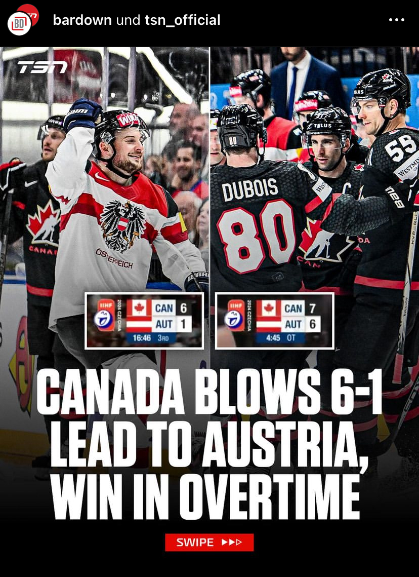 Just 15 seconds into overtime, though, Canadian captain John Tavares walked in and snapped a shot past Austrian goaltender David Madlener, which avoided this result becoming the largest comeback ever (although it will go down as the largest blown lead in tournament history).