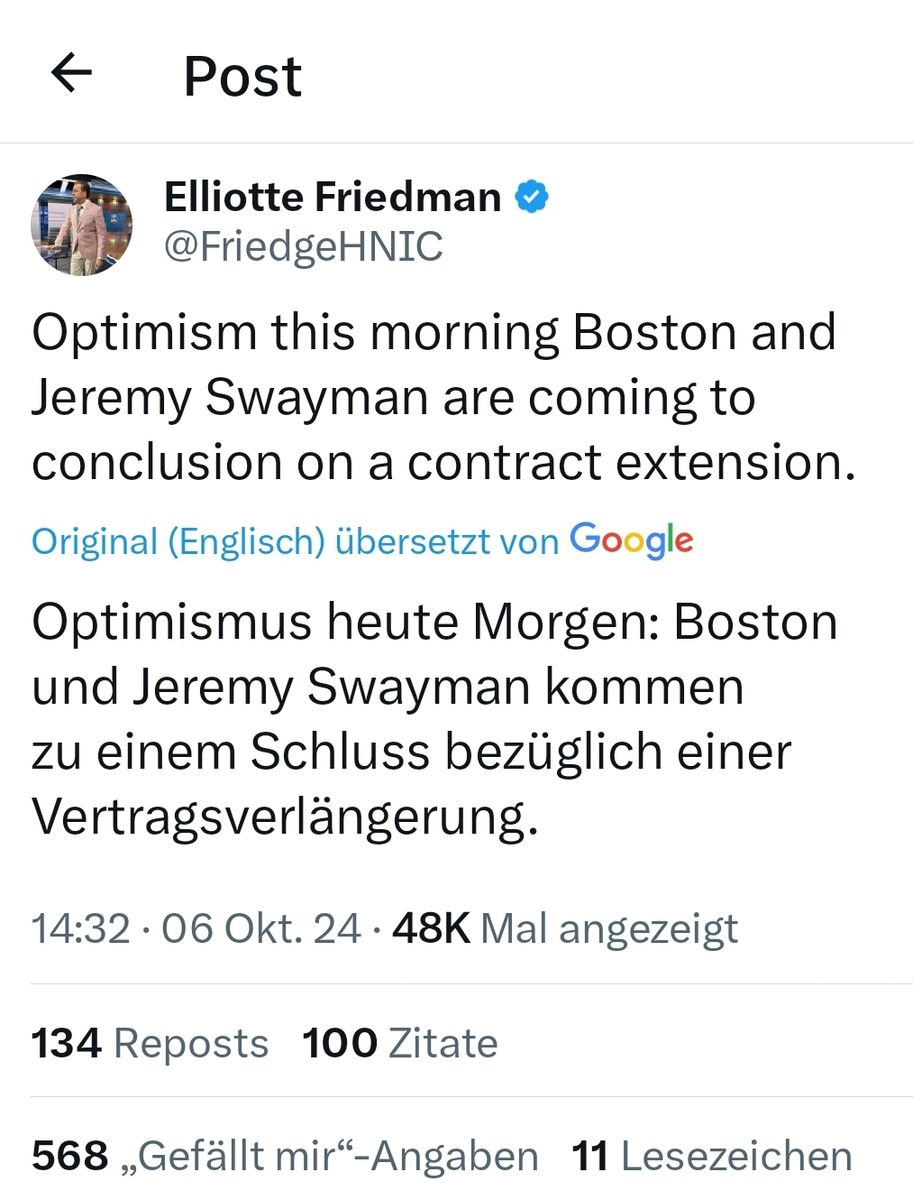 ganz ehrlich, je länger das dauert, desto höher der Druck auf Swayman. Als Fan seh ichs halt net ein, warum jmd mit +/- 150 Karrierespielen und seinen 40-45 Spielen pro Saison bis dato hier einen Monstervertrag haben will. Ich kann zwar nachvollziehen, dass er keine Longterm Deal unterschreiben will, aber man wir sich doch bitte auf 4x8Mio. (mehr pro Saison geht capmäßig eh nicht) einigen können. Dann bekommt er das meiste was er in Boston bekommen kann und hat seinen Bridging Deal und Boston hat 4 Jahre seinen Goalie. In 4 Jahren schaut eh wieder alles anders aus, könnte ja auch ein Risiko sein, Swayman als Vollzeit 1er mit 60-70 Spielen zu installieren.