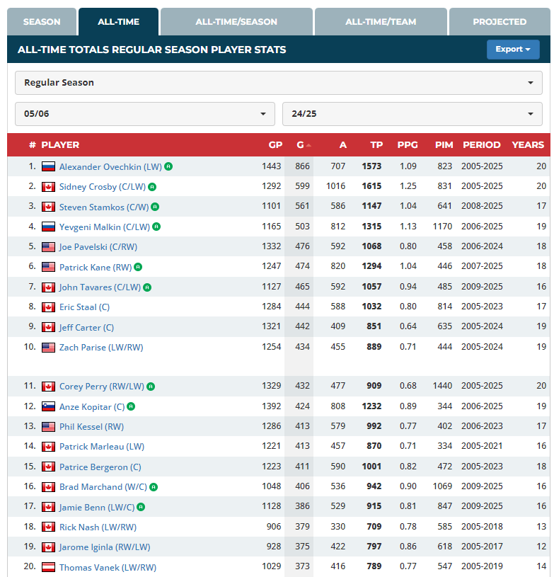 Wenn es "era adjusted" wäre, wär Ovi schon lange vorne: