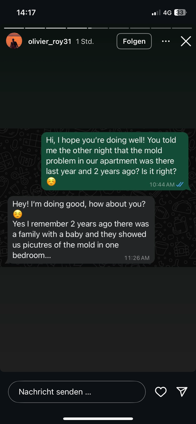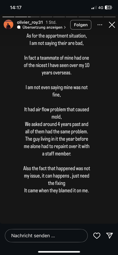 Auch bei den Aussagen von Roy gibt es nämlich so einige Ungereimtheiten! Zum Schimmel: natürlich ein absolutes NO GO! Aber auch hier: von welchem Datum sind diese Fotos? wer sind die ominösen whatsapp-Mitteiler? wann wurde der Verein von Roy informiert? was hat der Verein gesagt? was hat der Vermieter gesagt? wieso ist Roy in 5 Jahren ICEHL der EINZIGE Ausländer der sich öffentlich darüber beschwert? wieso kommt dieser Post nicht im November (Vertragsauflösung), sondern genau jetzt? wieso bleibt Roy in so einer Wohnung FREIWILLIG, ganze 3 Monate! nach der Vertragsauflösung?