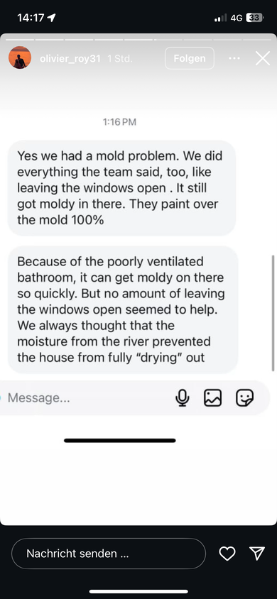 Zwecks Schimmel und wer die Schuld dafür hat: es kann beim Bau Mängel geben aber auch ein falsches Lüften kann dazu führen. Ich glaube das wissen wir alle selbst. Für mich ist die Story von Roy schon glaubwürdig, dass es wiederkehrendes Problem gewesen sein wird.