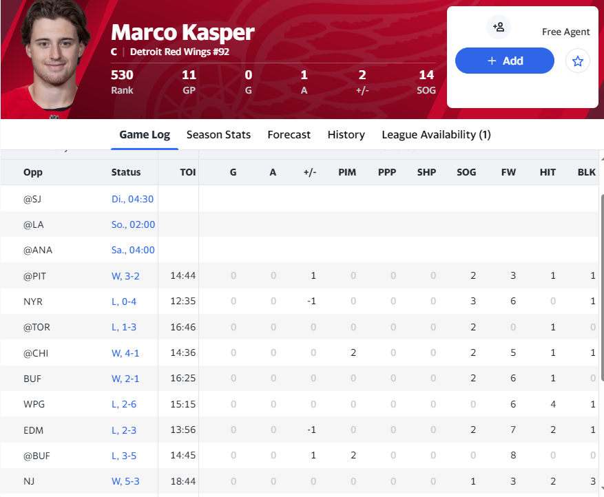 Ich hoffe sie haben noch etwas Geduld mit ihm. Er scheint ja am Eis die richtigen Dinge zu tun, aber mit dem Scoring haperts halt noch. Hier ein paar Stats von ihm aus den letzten Spielen: