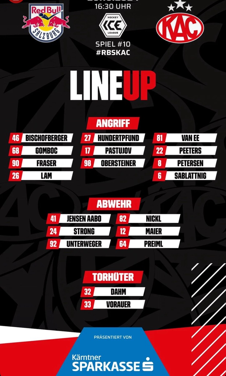 Sorry aber mit dem Lineup muss schon sehr viel Glück auf unserer Seite und sehr viel Unvermögen auf RB Seite passieren das der KAC diesed Spiel heut gewinnt.
