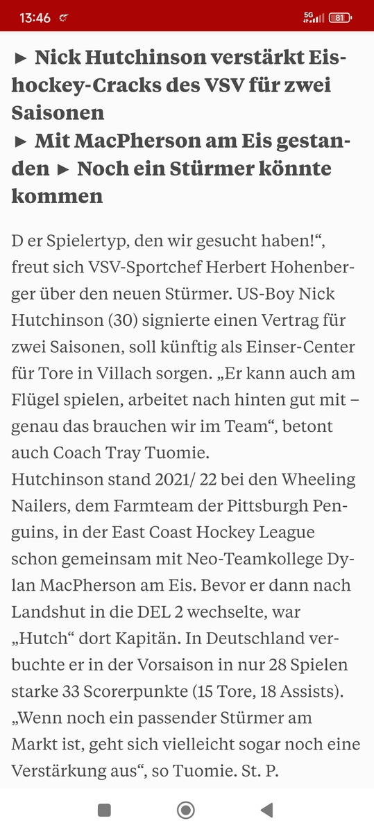 Die Krone liegt in Villach oft richtig, dieser Artikel ist allerdings Blödsinn. Ein Stürmer kommt noch, Namen habe ich keinen. Wenn man allerdings an einen Schnarr gedacht hat wird wohl noch Asche über sein. Der Hutchinson ist sicher keiner für eine vordere Linie. Aber ich frag mich echt wozu wir einen Sportdirektor haben, den Typ hätte ein Napokoj oder auch ein Schwab auch locker gefunden. Außerdem hat er mit DMac gemeinsam gespielt, denke der hat hier auch was beigetragen.