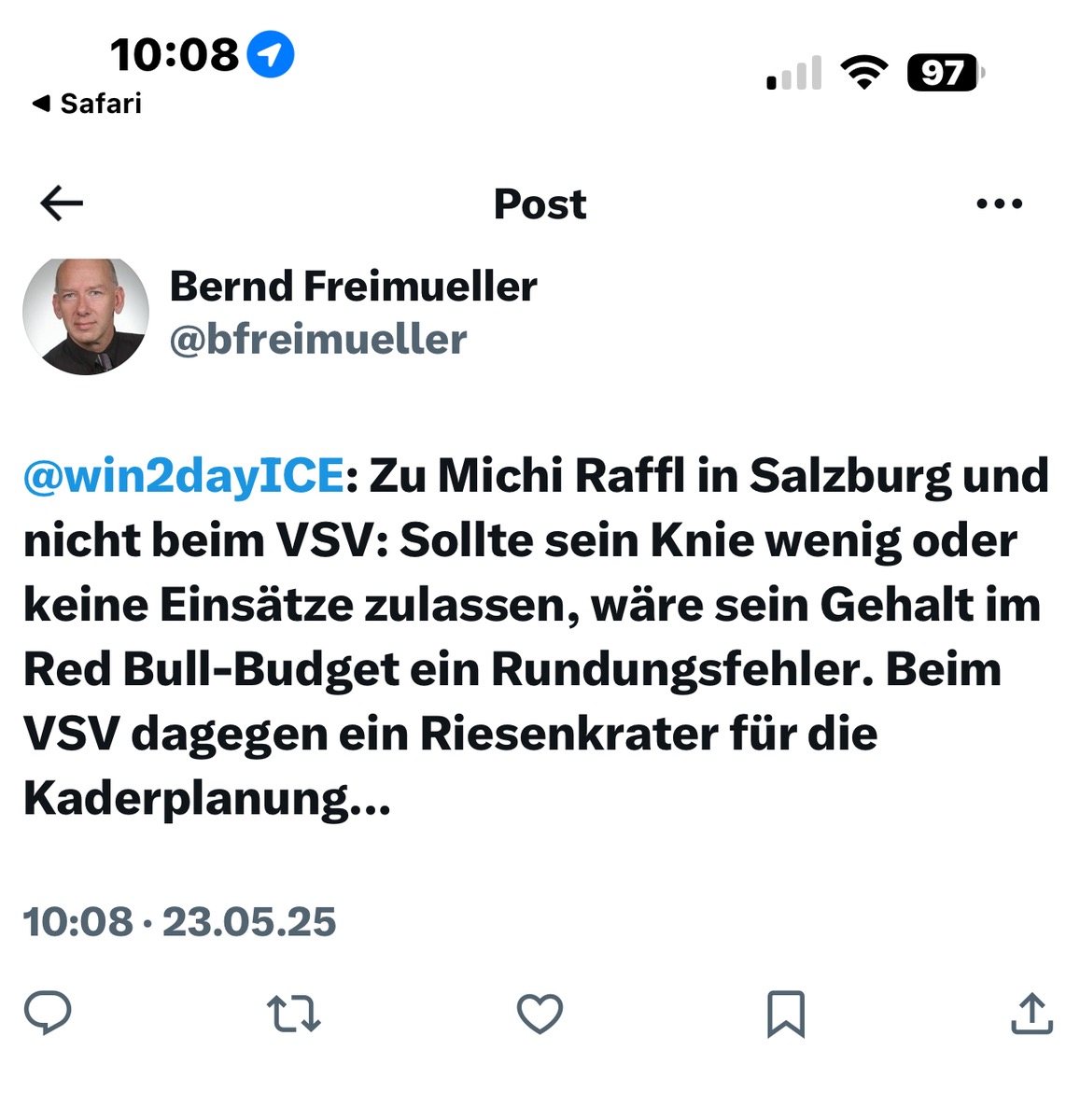 Ich habe mit Michi Raffl im Rahmen einer Reportage vor ziemlich genau 10 Jahren gesprochen über NHL und Geld. Damals hat er mir auf meinem Handy ein Interview gegeben, welches ich noch aufgezeichnet habe. Er meinte, dass ihm Geld egal ist, er spielt auch für ein Butterbrot. Leider ist sein damaliger Charakter nicht standhaft geblieben. Aus meiner Sicht ist es ein trauriger Umstand, wenn man trotz äußerst gut bezahlter 12 - 13 Jahre, nicht zu seinem Heimatverein zurückkehrt und auch für sein Herz und Ehre einsteht und wahrscheinlich auch noch genug verdient. Aber ich glaube das ist im Kleinen das Problem wie im Großen. Geld regiert die Welt. Wenn Raffl mal alt ist und in Villach selbst im Stadion sitzt, wird es Ihm grauen: Ein Butterbrot in der Heimat schmeckt halt einfach besser...und Geld kannst nicht fressen.