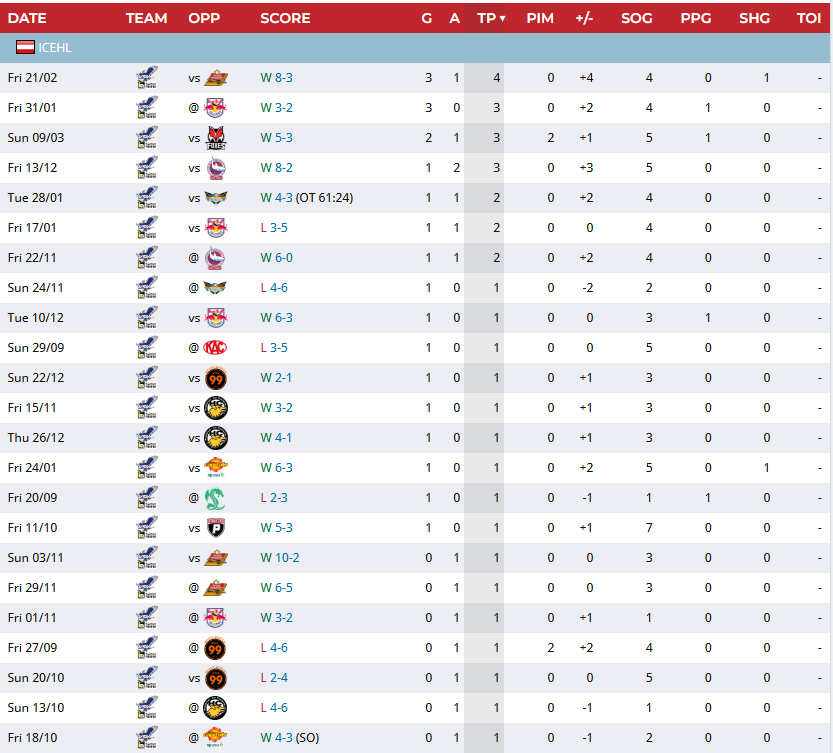 Absolut Richtig, einmal gegen Salzburg. Liest sich auch in Summe recht gut, gute Aufteilung gegen die Top 6/Bottom 6 Teams der Liga, passable +/- und ein Top 20 Liga Goal-Scorer. Außerdem hat der Herr schon letztes Jahr bewiesen, dass er mit besseren Linemates noch mehr zur Geltung kommen kann. Wär für mich tatsächlich auch jemand, der Rebse in Linie 1 erstzen könnte, wenns bei dem nächstes Jahr nicht so läuft. Ich mag den jedenfalls irgendwie.