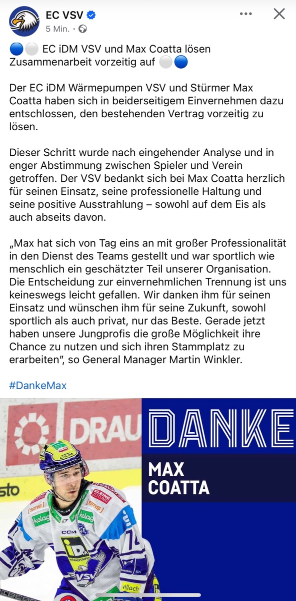 Dieser Schritt wurde nach eingehender Analyse und in enger Abstimmung zwischen Spieler und Verein getroffen. Der VSV bedankt sich bei Max Coatta herzlich für seinen Einsatz, seine professionelle Haltung und seine positive Ausstrahlung – sowohl auf dem Eis als auch abseits davon.