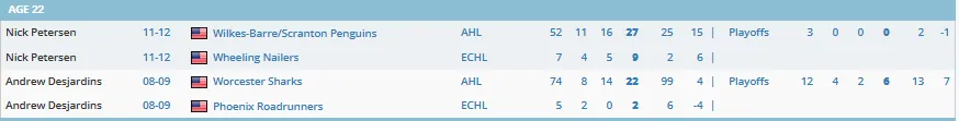 Ich bin der Meinung, dass Desjardins wahrscheinlich auch in seiner Prime nicht an die Pass Skills eines Petersen in seiner Prime rangekommen ist. Mit 22 warens eh bspw. beide in der AHL, wenn du auf solche Vergleiche stehst (sagen mMn halt auch nur bedingt was aus):