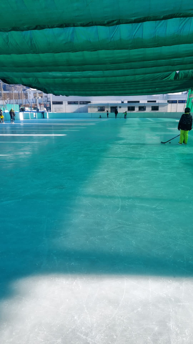 Sieht auf den Bild schon so aus, als würde der Asphalt weit über die Spielfläche auf der Seite hinausragen. Wenn das der Fall ist, sagt der Physikamateur in mir, könnt ihr die Eisfläche noch so viel abdecken. Der Asphalt wird die wärme zumindest bis zum Rand der Eisfläche leiten. Ihr müsst irgendwie auch verhindern, dass sich der Asphalt außerhalb der Banden erhitzt oder ihn abtrennen und ein nicht wärme leitendes Material dazwischen bringen.