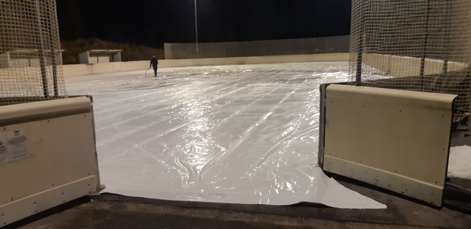 Ich kenn diese Art der Eisherstellung von meinem ehemaligen Verein. Da brauchts ein paar kalte Tage um den Boden anständig einfrieren zu lassen, dann wird mit Wasser aufgespritzt. Am besten geht das ganze, wenn der Platz sehr eben ist und zusätzlich der Spalt unter den Banden bestmöglich abgedichtet ist, sodass kein Wasser entweichen kann.