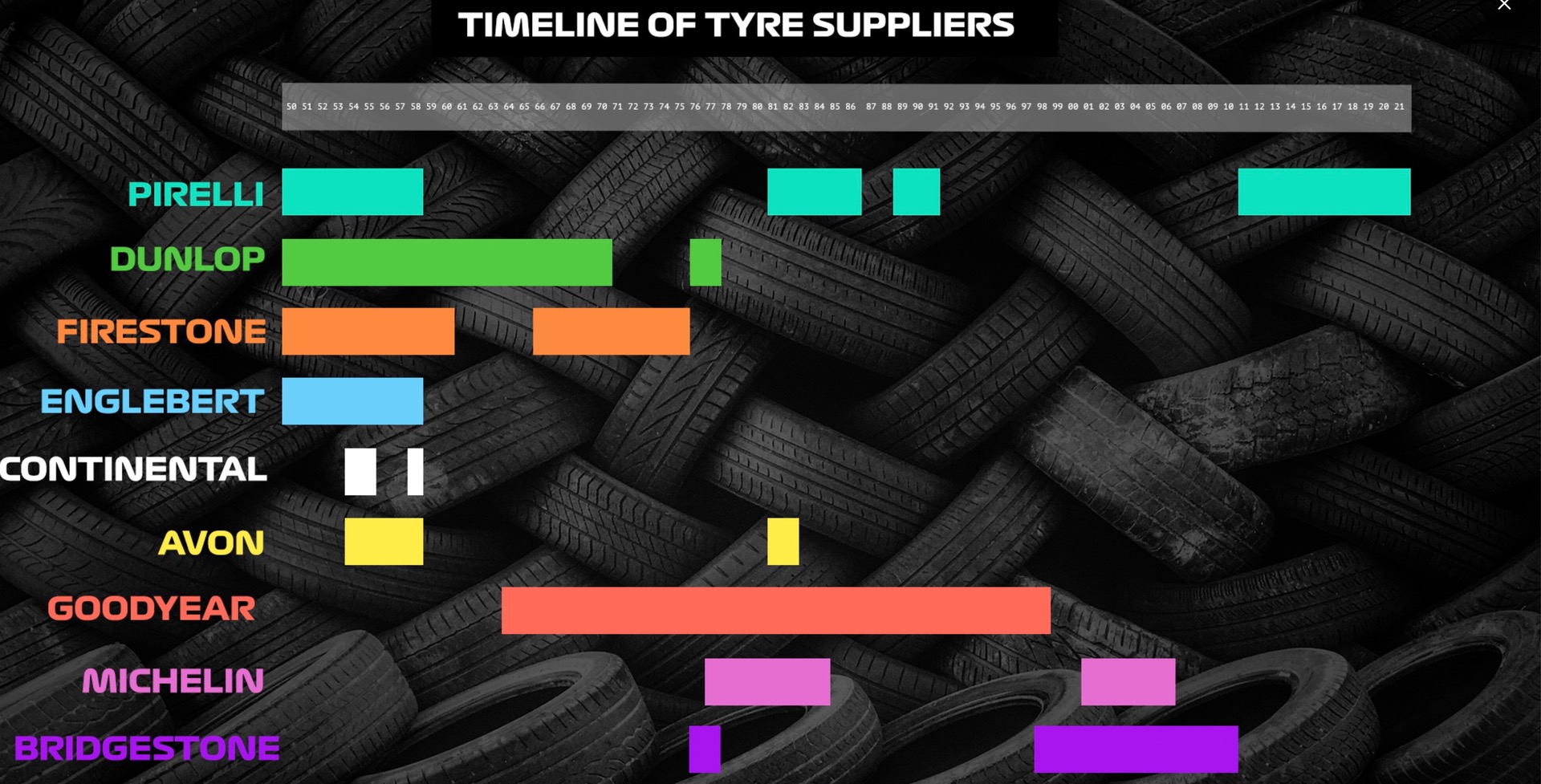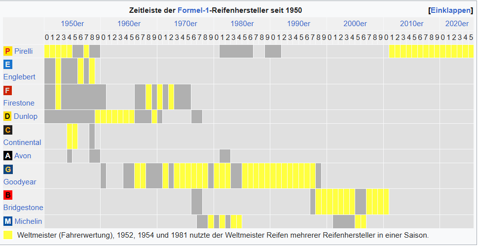 hier eine Zeitleiste, welcher Hersteller Reifen zur Verfügung gestellt hat