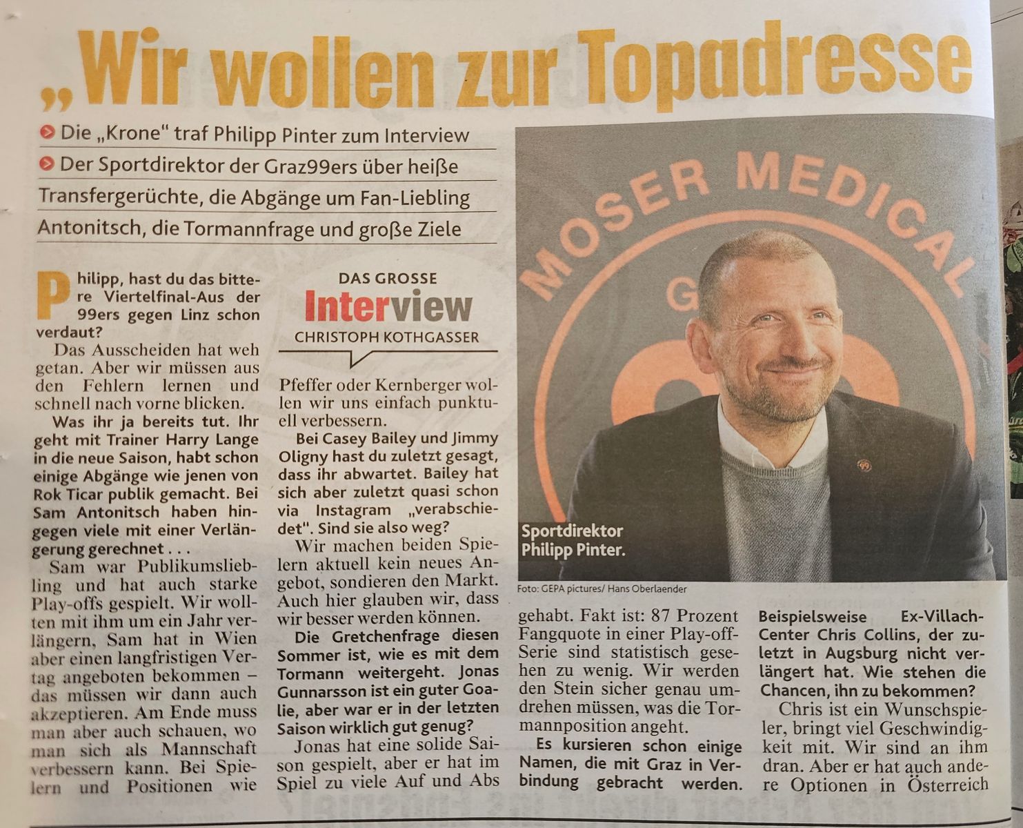„Wir wollen zur Top-Adresse im Eishockey werden!“Die „Krone“ traf Philipp Pinter zum Interview. Der Sportdirektor der Graz99ers über heiße Eishockey-Transfergerüchte, die Abgänge um Fan-Liebling ...www.krone.atVielleicht könnte ja Rotjacke79 den Artikel wieder hier reinstellen?
