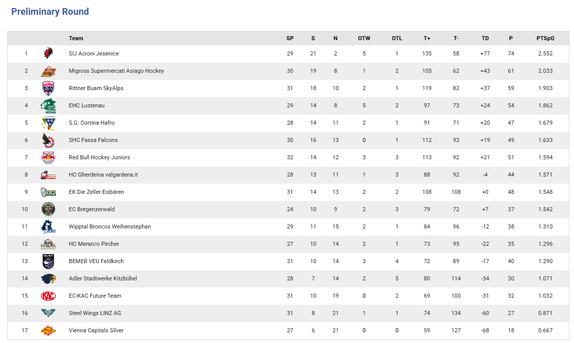 Es fehlt: Fassa, Lustenau und KAC Future Team - Aufgelöst oder ABgestiegen. Asiago, nicht wettbewerbsfähig in die ICE aufgestiegen und gescheitert. Zell würde das locker auch packen, natürlich kein Top 3 Team aber PO Quali traue ich ihnen zu.