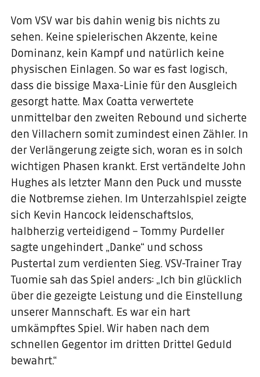 ZitatVSV-Trainer Tray Tuomie sah das Spiel anders: „Ich bin glücklich über die gezeigte Leistung und die Einstellung unserer Mannschaft. Es war ein hart umkämpftes Spiel. Wir haben nach dem schnellen Gegentor im dritten Drittel Geduld bewahrt.“