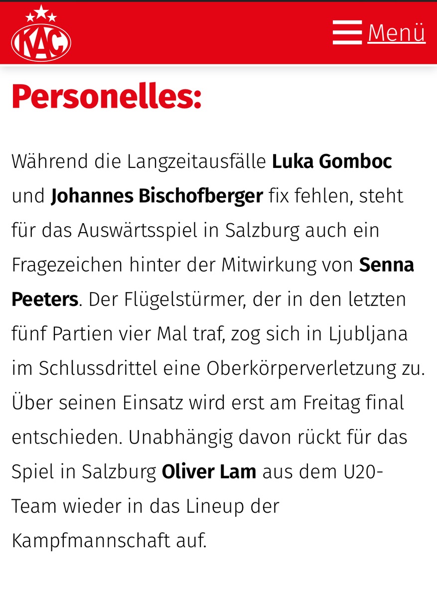 Peeters wie erwartet für morgen fraglich, somit laut KAC Wording wohl 2 Wochen out.