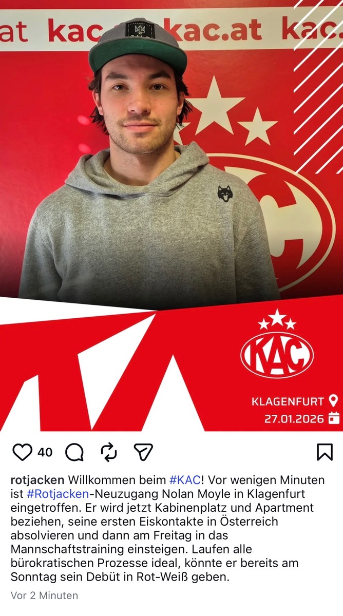 Nolan Moyle wird beim EC-KAC das Trikot mit der Rückennummer 67 tragen. In Klagenfurt ankommen wird er in den kommenden Tagen, parallel zu seiner Integration in den Trainingsbetrieb laufen dann die behördlichen Anmeldeprozesse, nach deren Abschluss der US-Amerikaner bei den Rotjacken auch in den Spielbetrieb einsteigen wird.