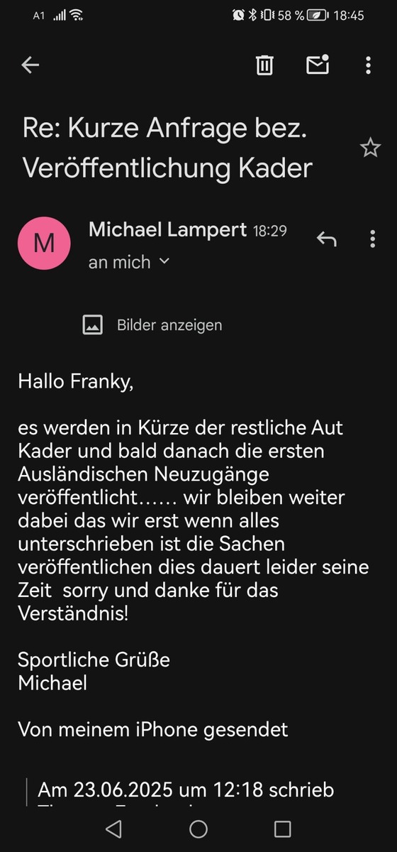 Diese Info habe ich gestern vom Sportdirektor Michael Lampert bekommen auf meine Anfrage wann endlich mal wieder neue Infos veröffentlicht werden! Sportliche Grüße an alle!
