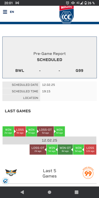 Hat den Titel des Themas von „49.R. EHC Black Wings Linz - Graz 99ers, Mi. 2025-02-12 12:15 Uhr“ zu „49.R. EHC Black Wings Linz - Graz 99ers, Mi. 2025-02-12 19:15 Uhr“ geändert.