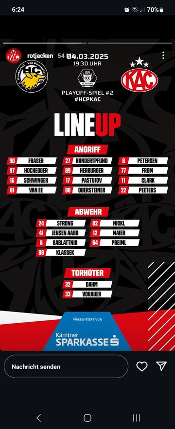 VF - Game 2: HC Pustertal EC KAC DI. 04.03.2025 live auf Puls24 um 19:30 Uhr