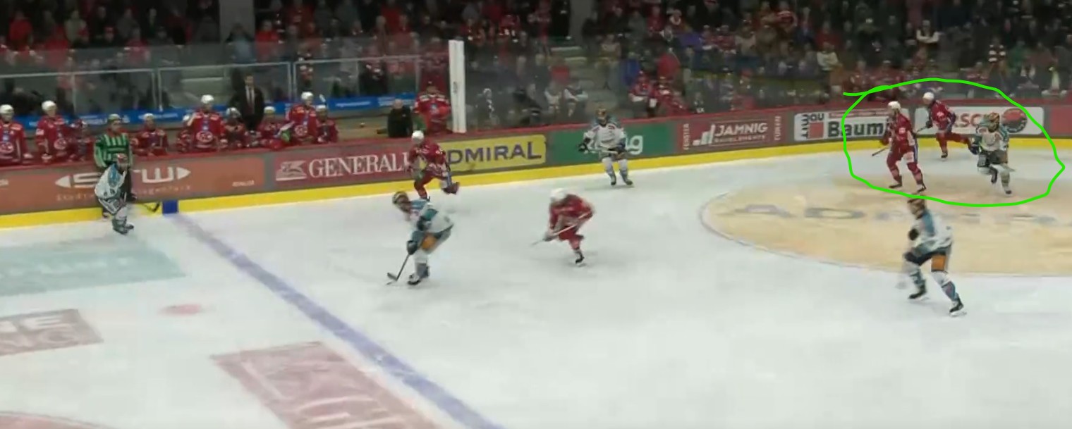 Natürlich kommt dann auch noch der eher laxe Backcheck der anderen zwei dazu. Aber grundsätzlich passiert der Fehler beim Entry ins eigene Drittel wo zwei KACler auf einen Linzer gehen.
