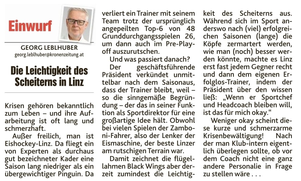 come on - das war so klar. sobald es wo nicht läuft, ist Leblhuber da und suhlt sich darin. egal ob LASK, Blau Weiß, Ried oder jetzt eben mal wieder wir.